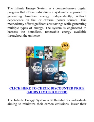 The Infinite Energy System is a comprehensive digital program that offers individuals a systematic approach to generating limitless energy independently, without dependence on fuel or external power sources. This method may offer significant cost savings while generating multiple types of energy. The system is engineered to harness the boundless, renewable energy available throughout the universe.CLICK HERE TO CHECK DISCOUNTED PRICE (24HRS LIMITED OFFER)The Infinite Energy System is well-suited for individuals aiming to minimize their carbon emissions, lower their
