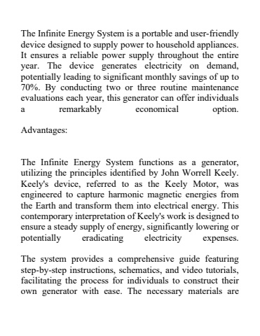 The Infinite Energy System is a portable and user-friendly device designed to supply power to household appliances. It ensures a reliable power supply throughout the entire year. The device generates electricity on demand, potentially leading to significant monthly savings of up to 70%. By conducting two or three routine maintenance evaluations each year, this generator can offer individuals a remarkably economical option. Advantages:The Infinite Energy System functions as a generator, utilizing the principles identified by John Worrell Keely. Keely's device, referred to as the Keely Motor, was engineered to capture harmonic magnetic energies from the Earth and transform them into electrical energy. This contemporary interpretation of Keely's work is designed to ensure a steady supply of energy, significantly lowering or potentially eradicating electricity expenses. The system provides a comprehensive guide featuring step-by-step instructions, schematics, and video tutorials, facilitating the process for individuals to construct their own generator with ease. The necessary materials are