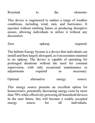 Resistant to the elements: This device is engineered to endure a range of weather conditions, including wind, rain, and hurricanes. It operates without emitting fumes or producing disruptive noises, allowing individuals to utilize it without any discomfort. Zero upkeep required: The Infinite Energy System is a device that individuals can install and then largely disregard, as it necessitates minimal to no upkeep. The device is capable of operating for prolonged durations without the need for constantsupervision, with only occasional maintenance or adjustments required as necessary. Optimal alternative energy source: This energy source presents an excellent option for homeowners, potentially decreasing energy costs by more than 70% while effectively powering all household devices. In the near future, this will become a widely accepted energy source for all individuals.